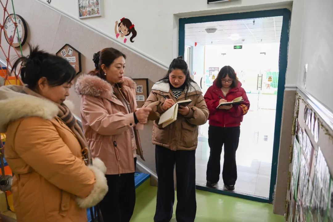↑2月25日,贵阳市观山湖区第三幼儿园园长潘亮(右一)对黄平县示范幼儿园室内环境创设进行现场指导。(张梓榕 摄)
